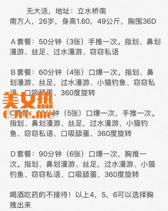 【寻欢时间】:2020年3月1日 【寻欢地点】:立水桥南 【信息来源】:论坛帖子 【服务项目】:小活无大,具体的看图 【妹妹数量】:自己做 【环境设备】:100,租的房子挺大的 【营业时间】:中午之前和傍晚之 ...